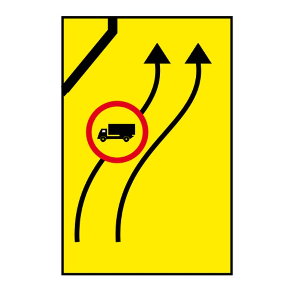 Se întâlnește pe sectoarele de drum unde se execută lucrări pe partea carosabilă, iar drumul prezintă o abatere temporară. Indicatorul rutier de interzicere sau restricție, nu permite pătrunderea vehiculelor destinate transportului de mărfuri, pe banda respectivă.