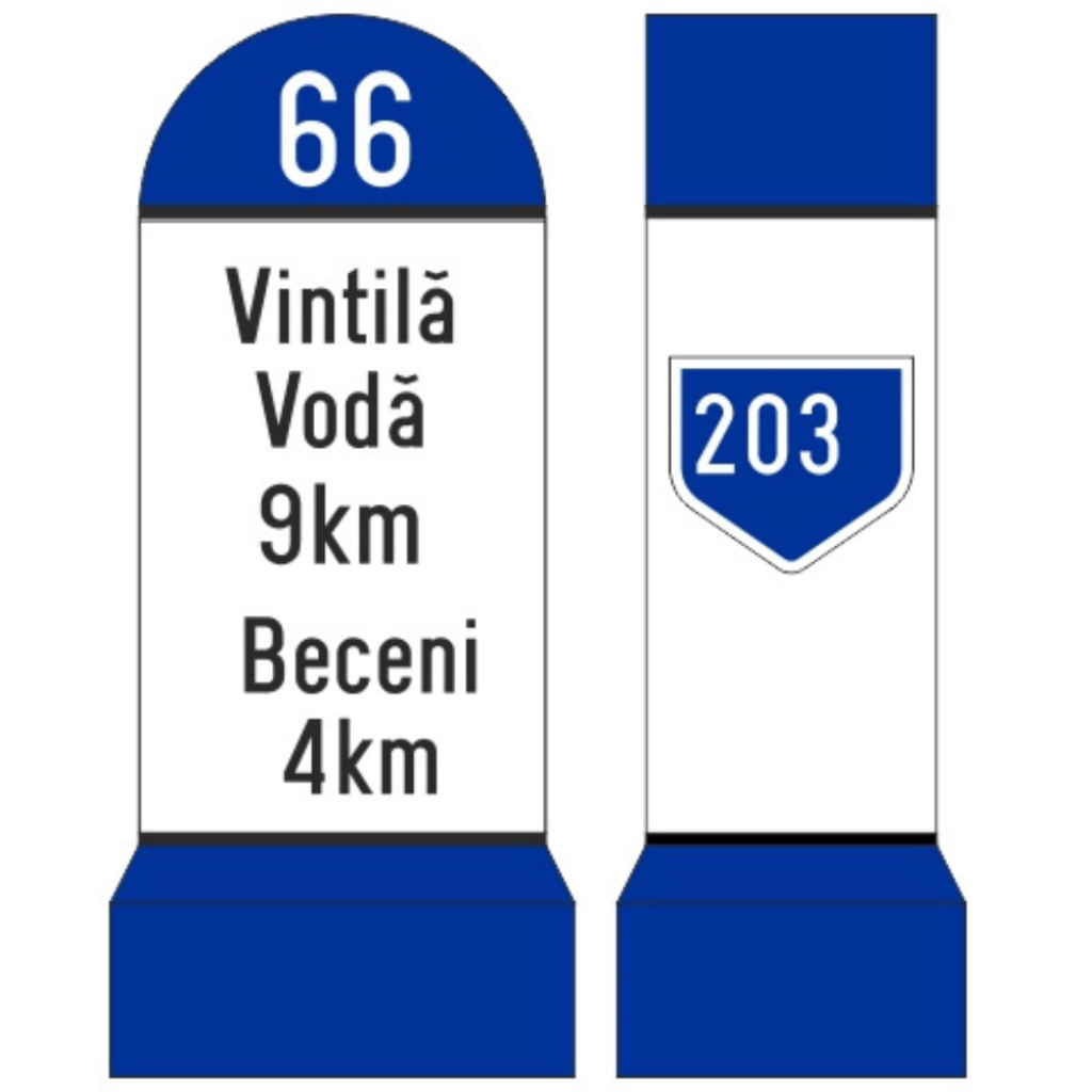 - Culoarea indicatorului kilometric și clasă de folie reflectorizantă utilizată diferă în funcție de categoria drumului.