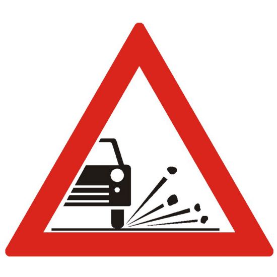 Indicator de avertizare A20 improscare cu pietris 700 mm folie reflectorizanta clasa 1 otel vopsit se amplasează la 100-200 m de sectorul de drum periculos. Poate fi însoţit de indicatorul Interzis autovehiculelor de a circula fără a menţine între ele un interval de cel putin ? m, deoarece exista riscul ca pietrişul de pe partea carosabilă să fie aruncata de roţile vehiculului către ceilalţi participanţi la trafic. La întâlnirea acestui indicator, Conducătorul auto este obligat să reducă viteza şi să păstreze o distanţă faţă de vehiculul care circulă în faţa sa.