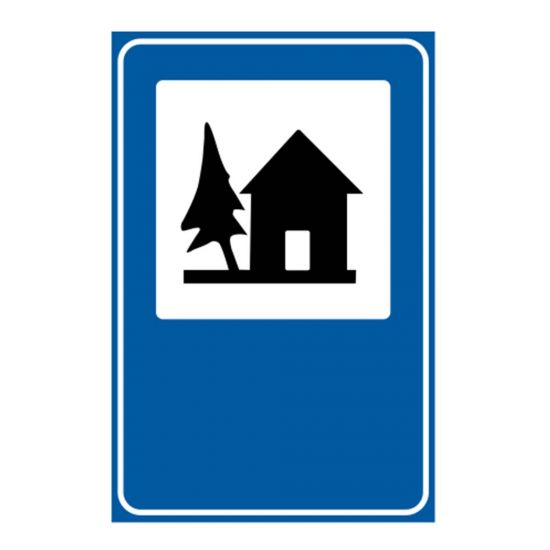 Indicator de informare G31 cabana pentru turisti 650x500 mm folie reflectorizanta clasa 1 otel vopsit indicatorul rutier din imaginea alăturată, se întâlnește în apropierea unei cabane pentru turiști.