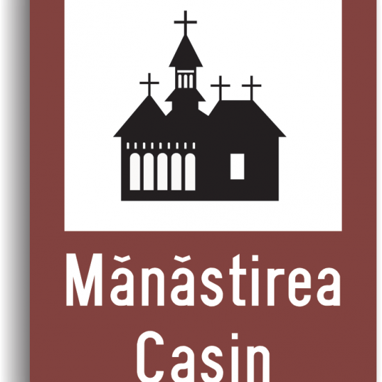 Indicator de informare turistica T5 Manastire 650x500 mm folie reflectorizanta clasa 1 otel vopsit ceste indicatoare rutiere de informare turistică, se întâlnesc de regulă în apropierea unor mănăstiri. În acest caz, conducătorul auto este informat că se află în apropiere de Mănăstirea Cașin.