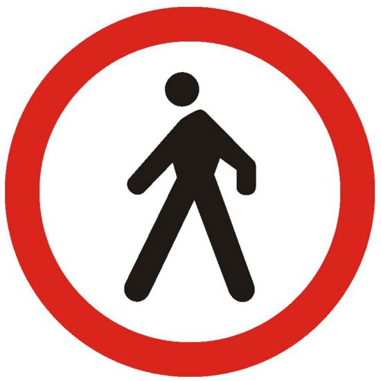 Indicator de interzicere sau restrictie C10 accesul interzis pietonilor 600 mm folie reflectorizanta clasa 1 otel vopsit restrictie interzice accesul pietonilor pe sectorul de drum public pe care este amplasat. Daca indicatorul se afla numai pe una dintre partile drumului, atunci circulatia pietonilor este interzisa numai pe acea parte. Pentru a se interzice accesul pietonilor pe ambele sensuri, se vor instala doua indicatoare, cate unul pe fiecare parte.