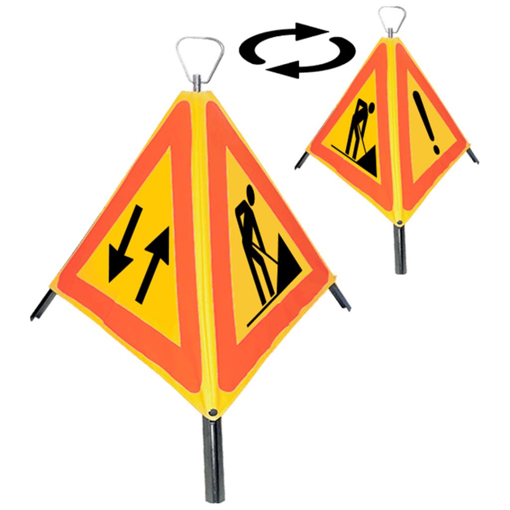 Indicatorul rutier pliabil cu 3 fete este confecționat dintr-o țesătură robustă din plastic. Fixarea pe sol se realizează printr-un trepied din otel zincat care-i conferă stabilitate ridicata. Mecanismul de rotire permite plierea/ deschiderea ușoară a indicatorului.
