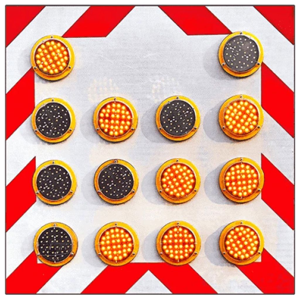 Panou rutier luminos semnalizare lucrari pentru bena autovehiculului 900x900 mm cu folie clasa 2 si 13 lampi LED este fabricat din aluminiu, folie reflectorizanta si lampi cu LED-uri