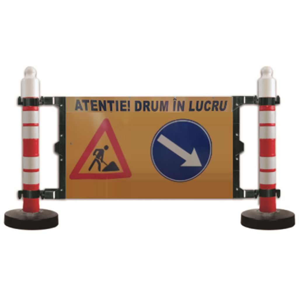 Panou semnalizare lucrari 1800x1200 mm, ocolire dreapta dispune de 2 socluri cu filet pentru indicatoare rutiere din plastic, lămpi sau alte produse.