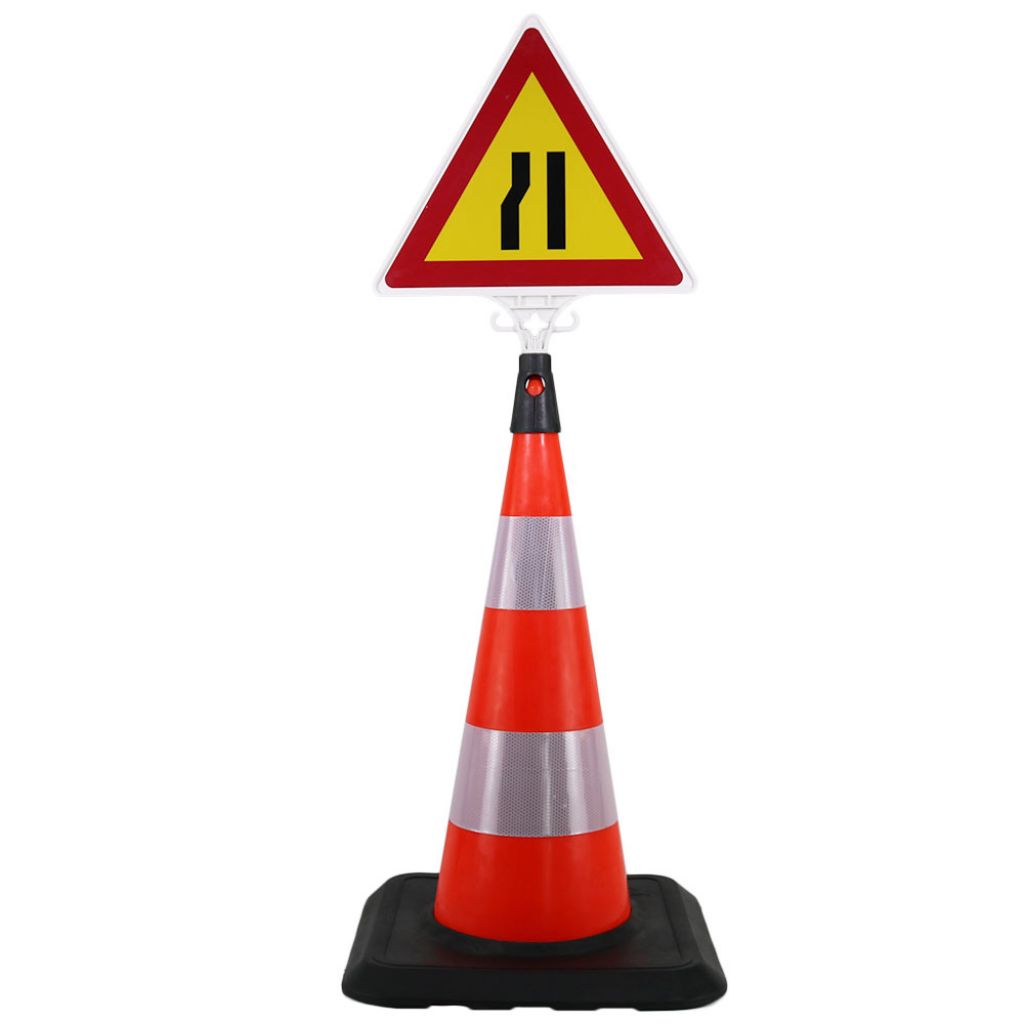 Pachet format din un con rutier cu inaltime de 750 mm si un indicator din plastic pentru drum ingustat pe partea stanga.
